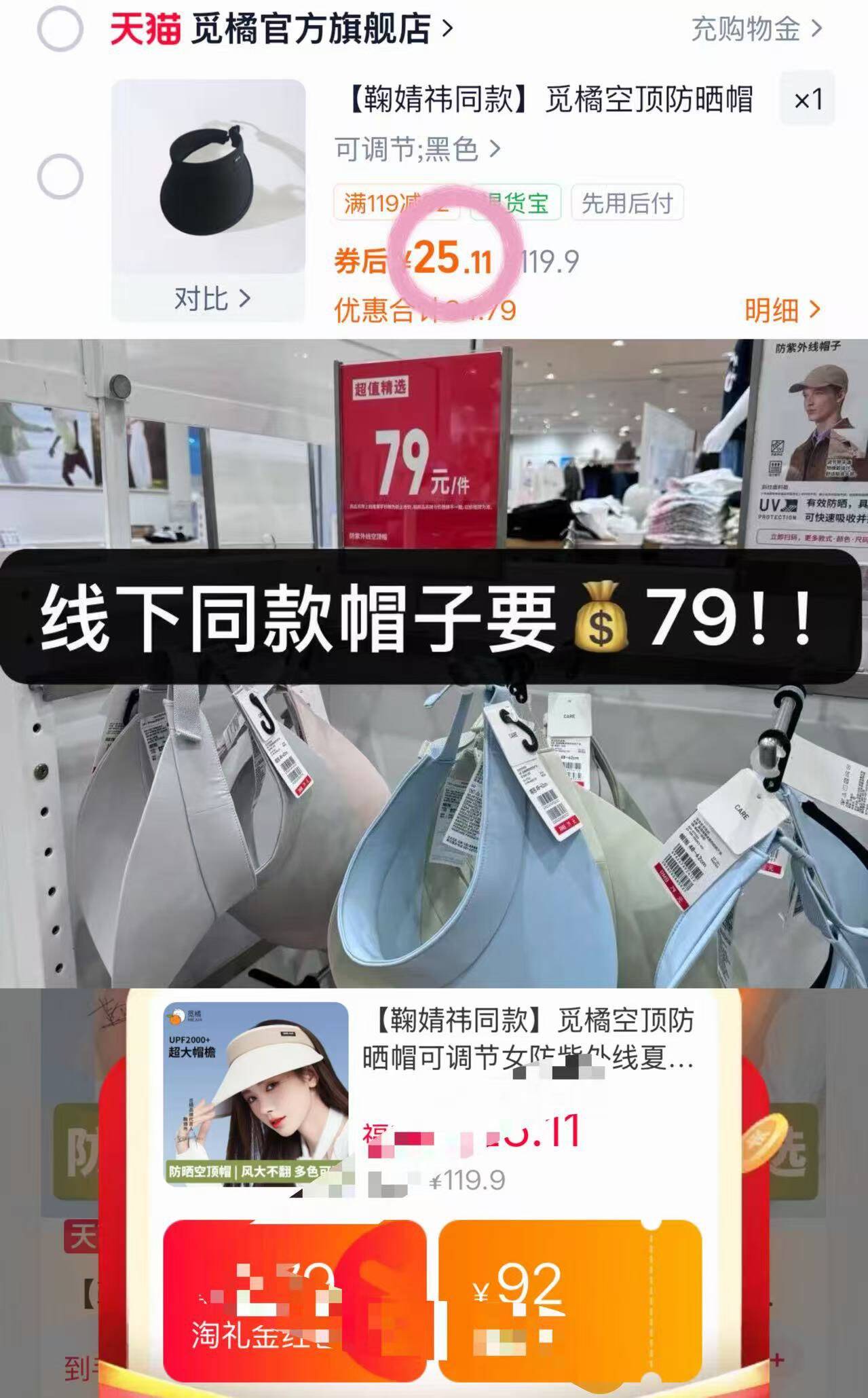 25元觅橘空顶防晒帽速